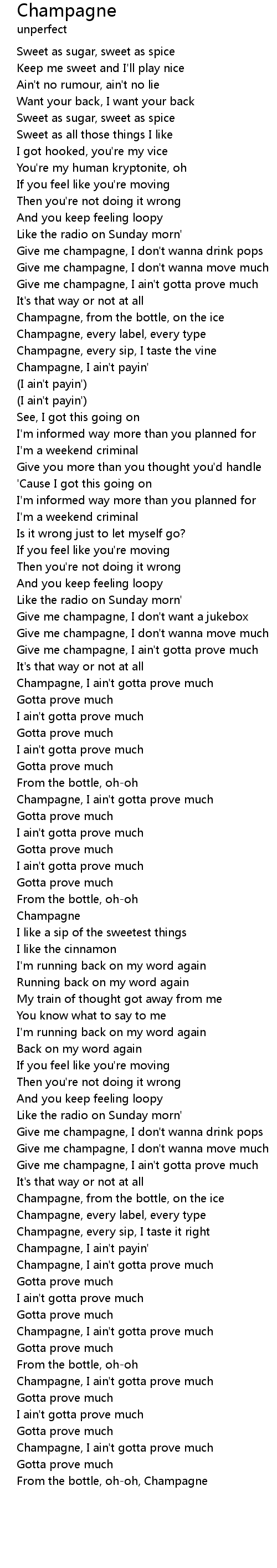 | [00:32.40] | Give me champagne, I ain't gotta prove much |
