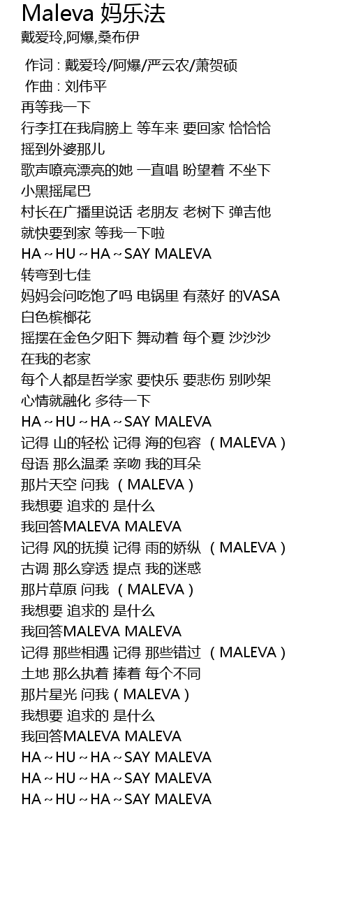| [03:32.861] | wǒ huí dá MALEVA MALEVA |