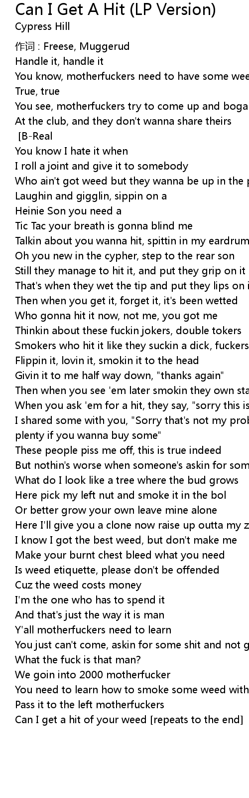 | Can I get a hit of your weed [repeats in background 6X] [B-Real] | |