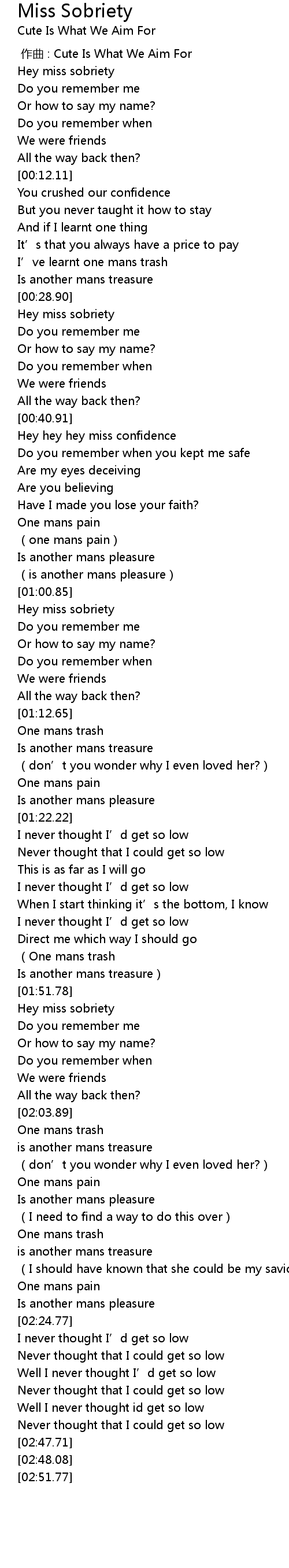 | [01:52.36] | Hey miss sobriety |