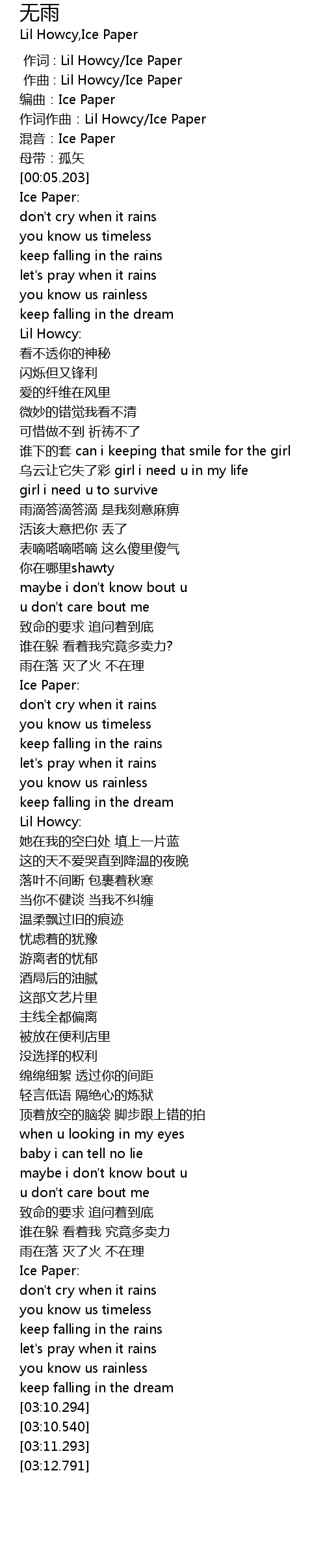 | [00:04.447] | 作词作曲:Lil Howcy/Ice Paper |