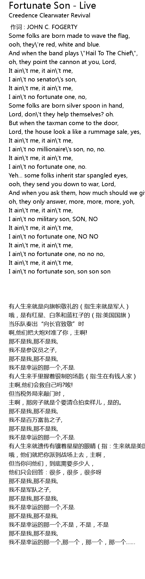 | [02:11.000] | I ain\'t no fortunate son, son son son |