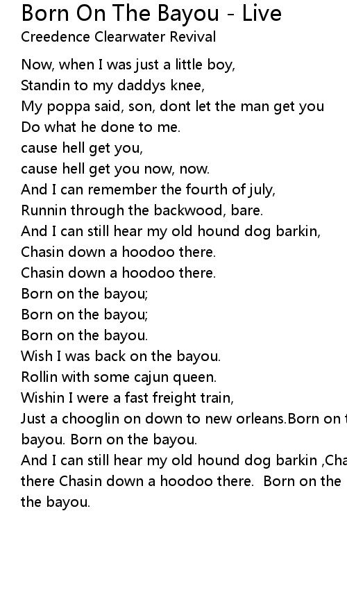 And I can still hear my old hound dog barkin ,Chasin down a hoodoo there Chasin down a hoodoo there. Born on the bayou. Born on the bayou.Born on the bayou. |