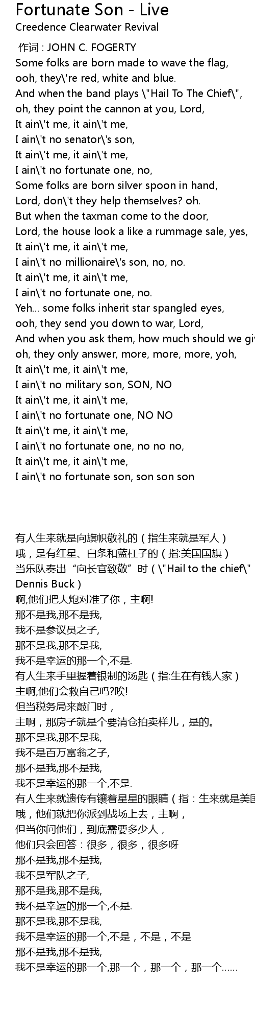 | [02:11.000] | I ain\'t no fortunate son, son son son |