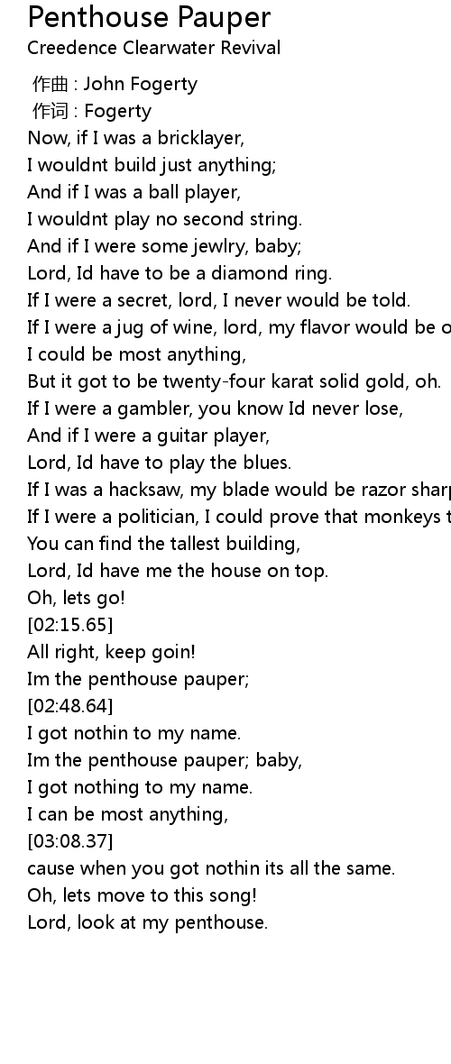 | [02:56.27] | Im the penthouse pauper baby, |