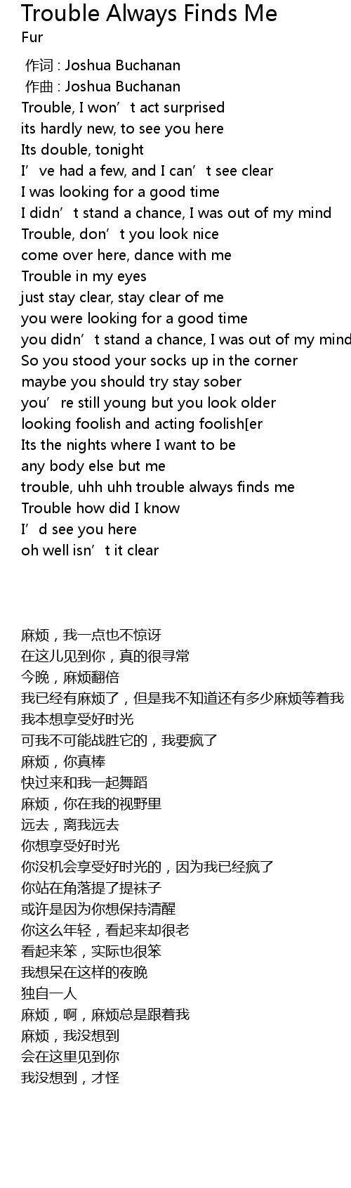 | [01:44.123] | trouble, uhh uhh trouble always finds me |