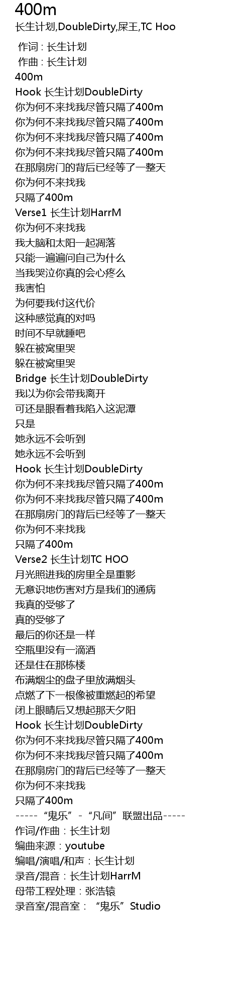 | [01:41.682] | ni wei he bu lai zhao wo jin guan zhi ge le 400m |