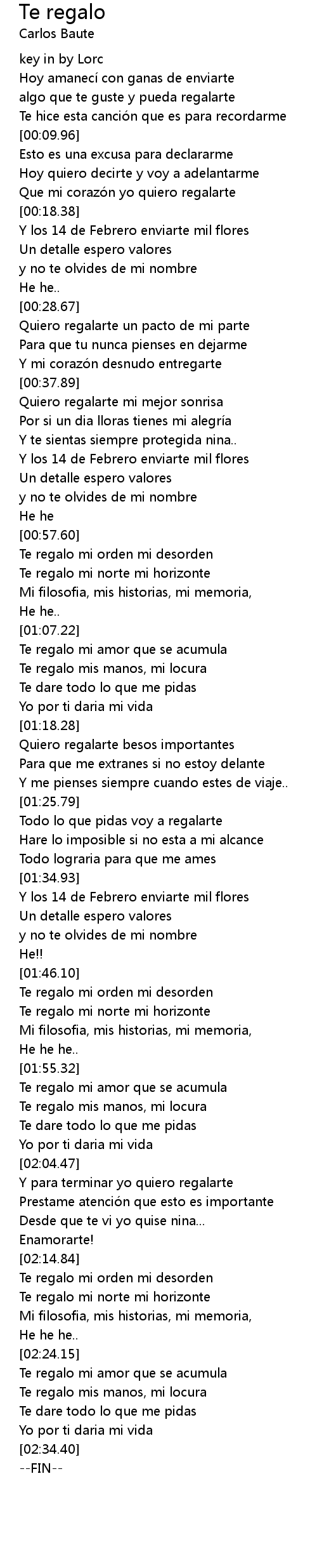 | [02:15.54] | Te regalo mi orden mi desorden |