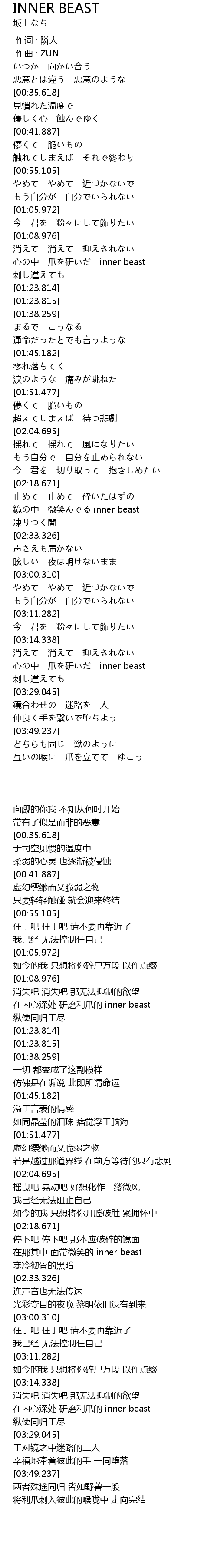 | [03:20.842] | 心の中 爪を研いだ inner beast |