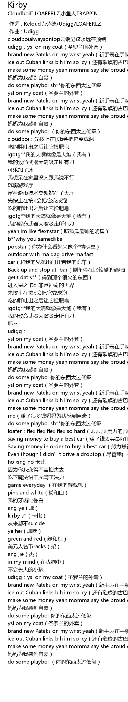 | [00:23.466] | brand new Pateks on my wrist yeah xin shou biao zai shou wan shang |