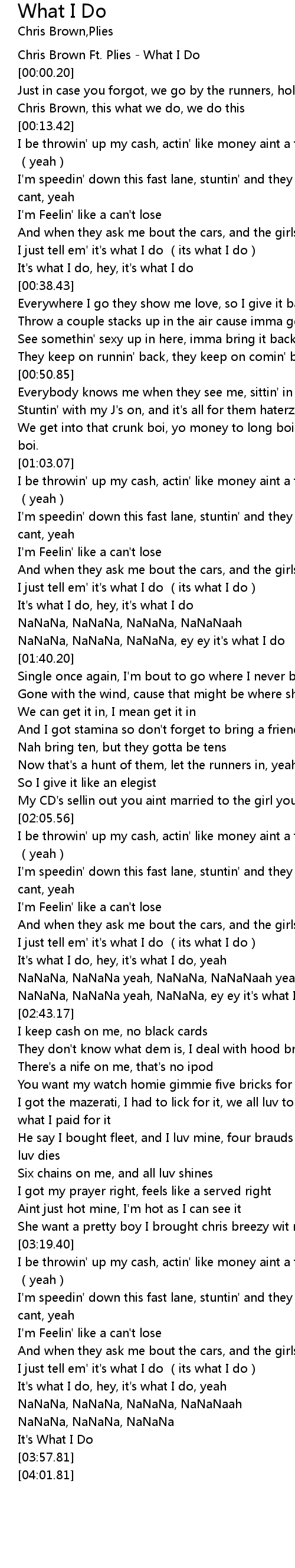 | [02:37.76] | NaNaNa, NaNaNa yeah, NaNaNa, ey ey it's what I do |