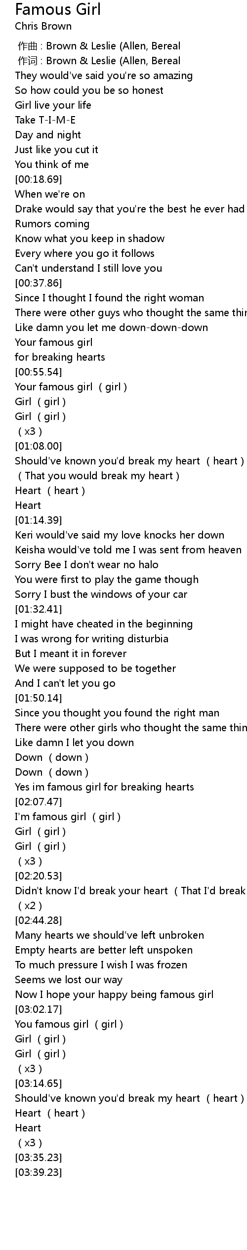 | [02:03.35] | Yes im famous girl for breaking hearts |