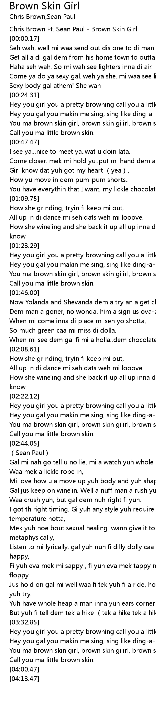 | [02:23.12] | Hey you girl you a pretty browning call you a little brown skin. |