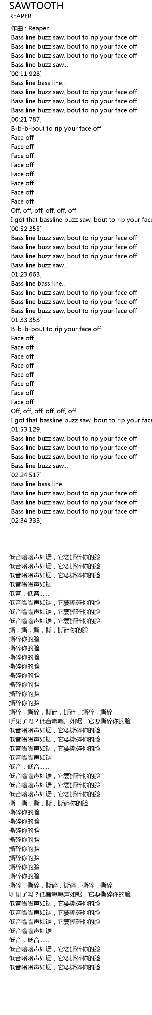 | [00:13.493] | Bass line buzz saw, bout to rip your face off |