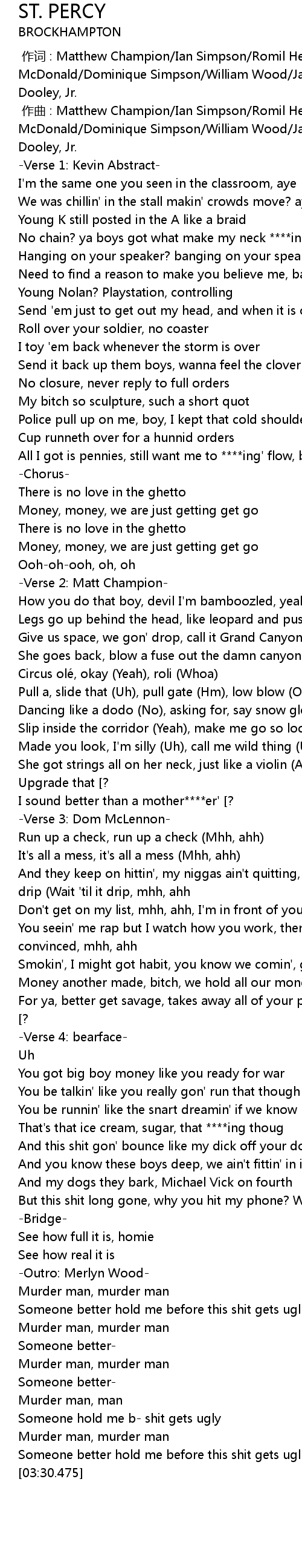 | [00:55.646] | All I got is pennies, still want me to ****ing' flow, bru |