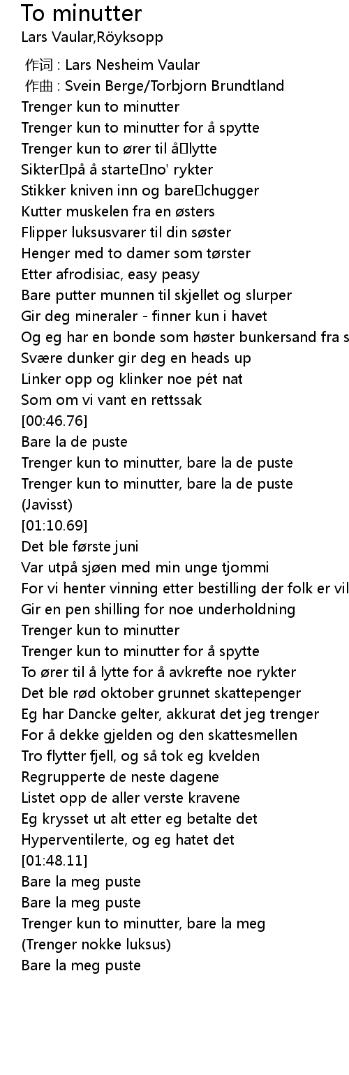 | [00:53.48] | Trenger kun to minutter, bare la de puste |