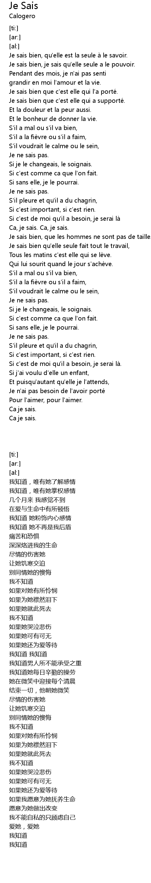 | [00:07.13] | Je sais bien, qu' elle est la seule à le savoir. |
