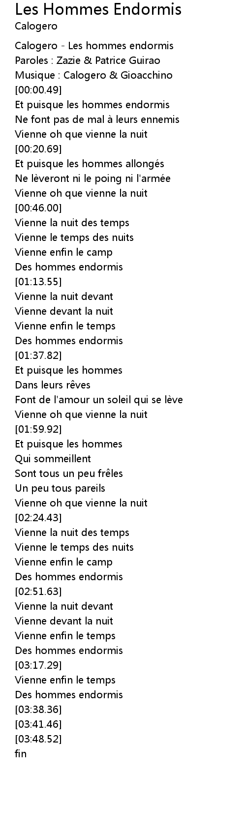 | [00:00.00] | Calogero Les hommes endormis |