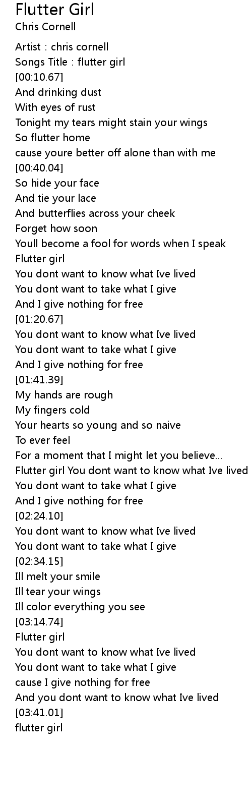 | [02:07.49] | Flutter girl You dont want to know what Ive lived |