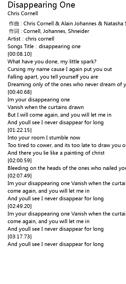 | [02:20.89] | Im your disappearing one Vanish when the curtains drawn But I will come again, and you will let me in |