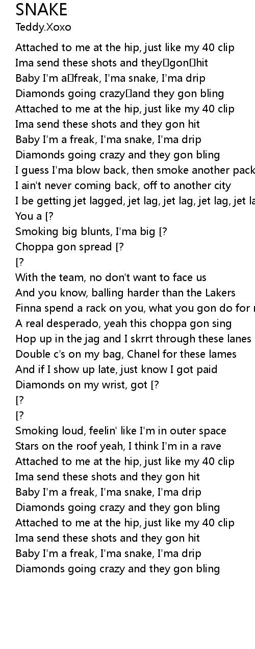 | [00:18.29] | Baby I'm a freak, I'ma snake, I'ma drip |