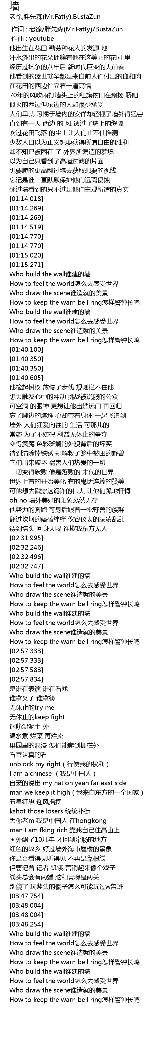 | [03:50.760] | Who build the wall shuí jiàn de qiáng |