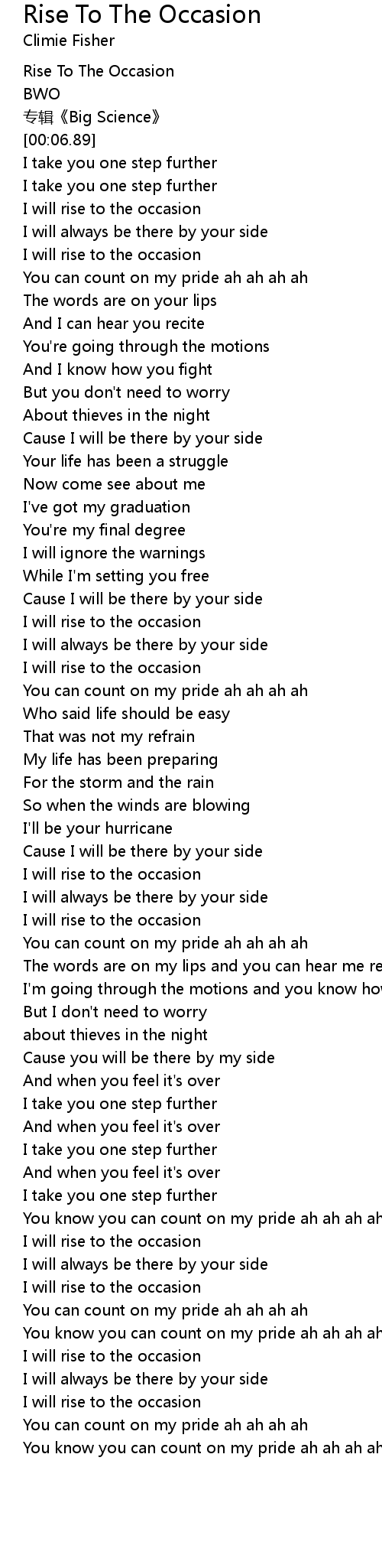 | [00:03.23] | Rise To The Occasion |