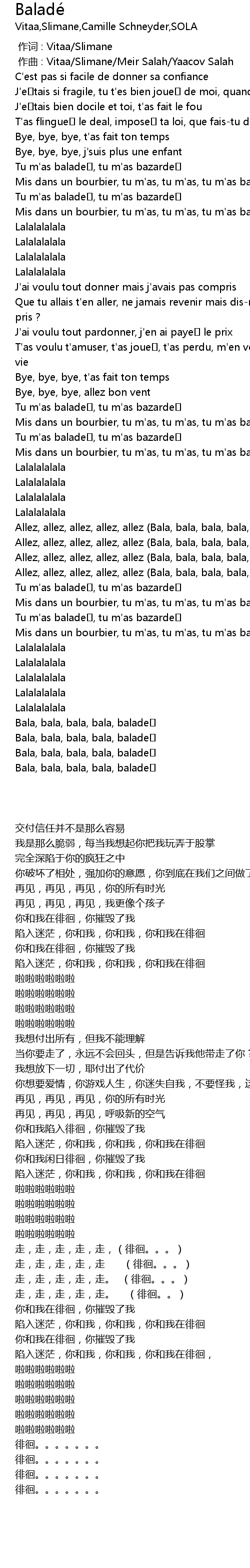 | [02:18.100] | Allez, allez, allez, allez, allez Bala, bala, bala, bala, balade |