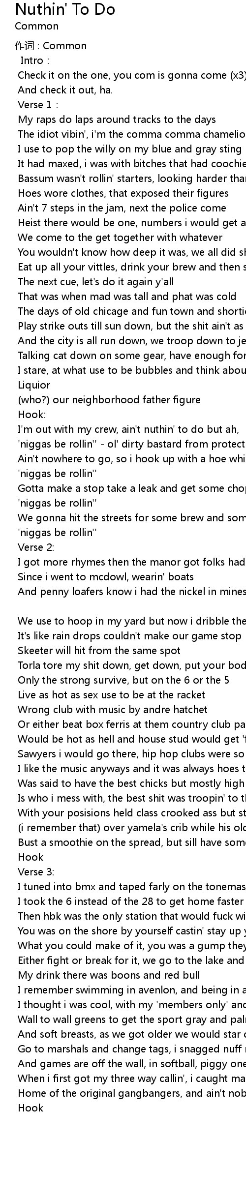 | Ain' t nowhere to go, so i hook up with a hoe while i | |