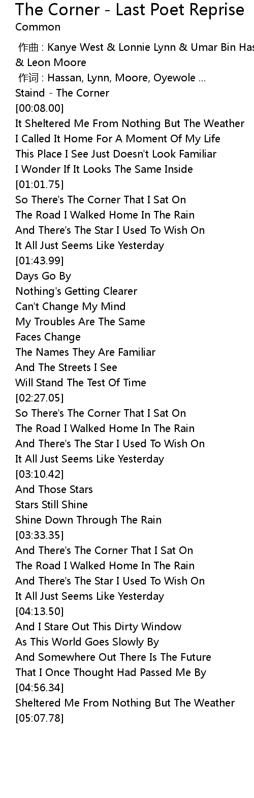 | [00:00.00] | 作曲 : Kanye West & Lonnie Lynn & Umar Bin Hassan & Abiodun Oyewole & Leon Moore |