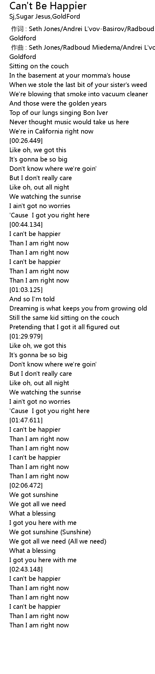 | [02:43.487] | I can' t be happier |