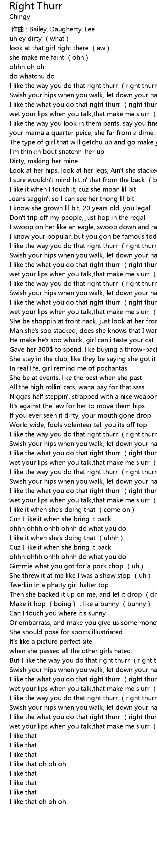 | [00:15.78] | I like the what you do that right thurr (right thurr) |