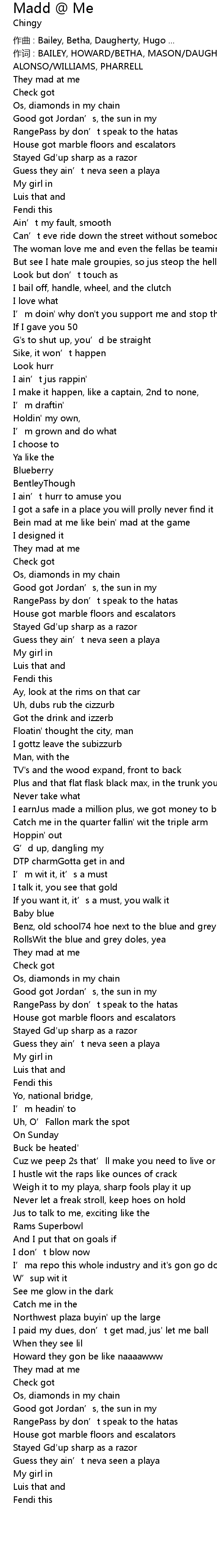 | 作词 : BAILEY, HOWARD/BETHA, MASON/DAUGHERTY, SHAMAR/HUGO, CHAD/LEE, ALONSO/WILLIAMS, PHARRELL | |