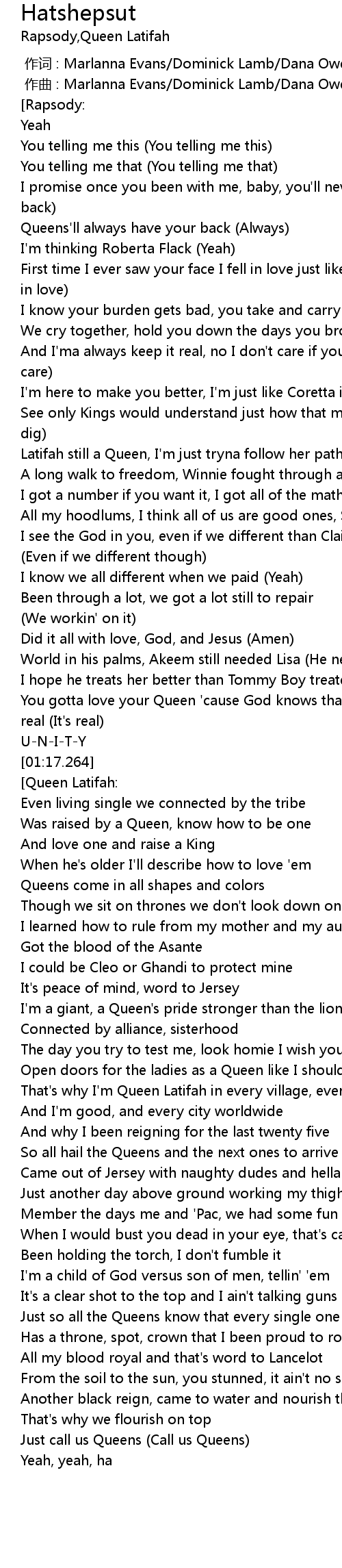 | [00:43.566] | Latifah still a Queen, I'm just tryna follow her path (You dig) |