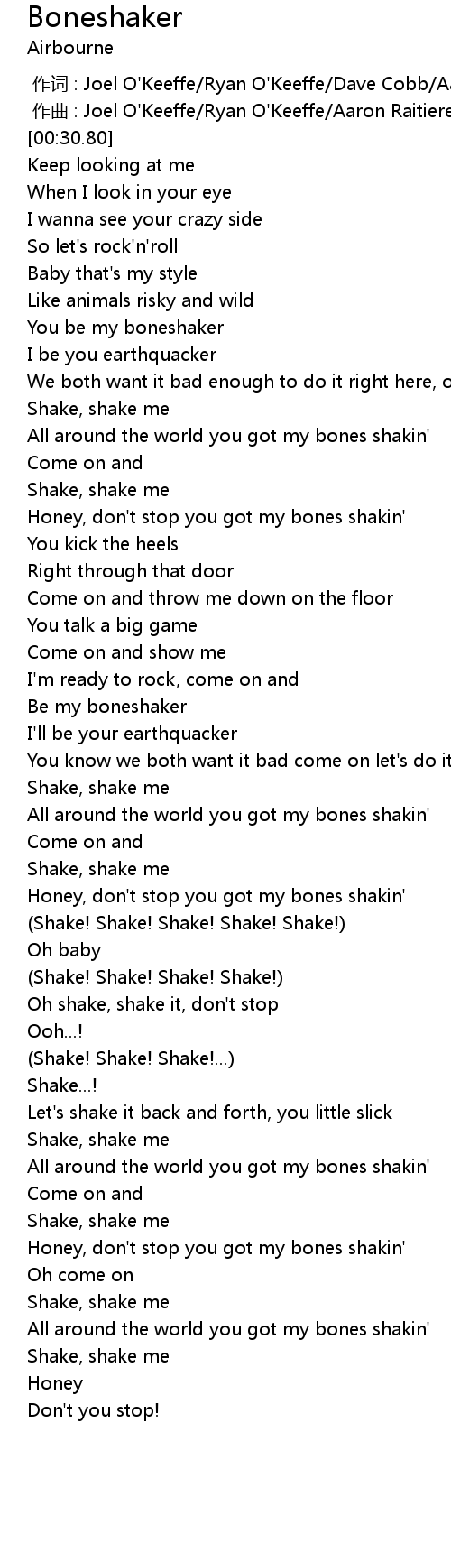 | [02:44.93] | Honey, don't stop you got my bones shakin' |
