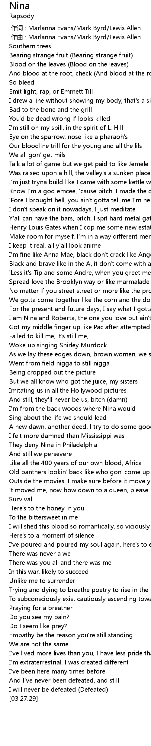 | [01:33.33] | I am Nina and Roberta, the one you love but ain't heard of |