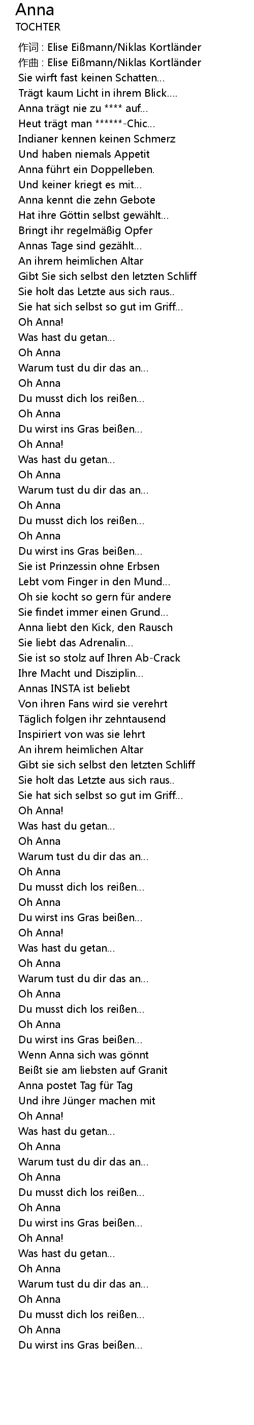 | [00:04.574] | Anna trägt nie zu **** auf… |