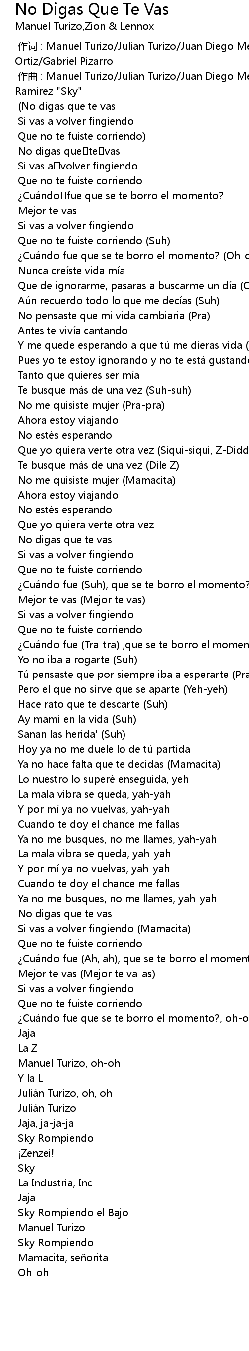 | [00:00.000] | 作词 : Manuel Turizo/Julian Turizo/Juan Diego Medina/Felix G. Ortiz/Gabriel Pizarro |