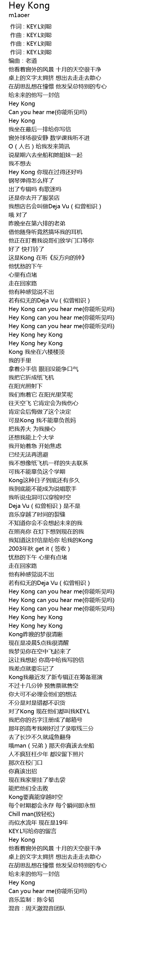 | [02:30.736] | Hey Kong can you hear me(你能听见吗) |