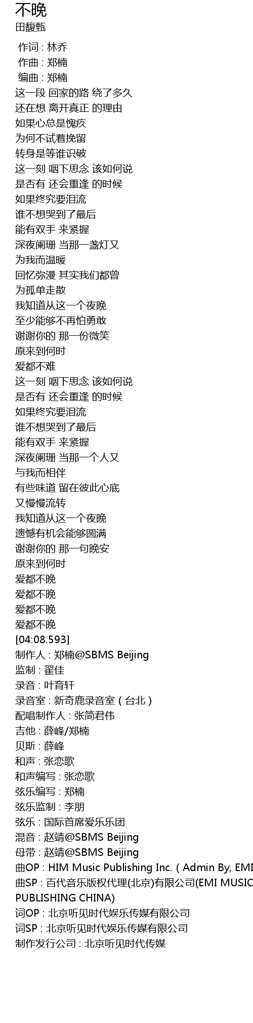 | [04:11.659] | 曲SP : 百代音乐版权代理(北京)有限公司(EMI MUSIC PUBLISHING CHINA) |
