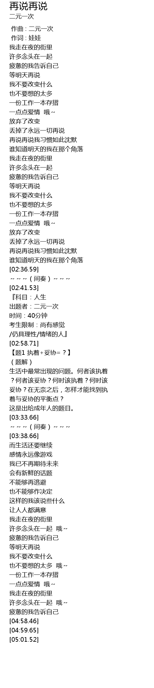 | [03:00.71] | 【题1 执着+妥协=?】 |