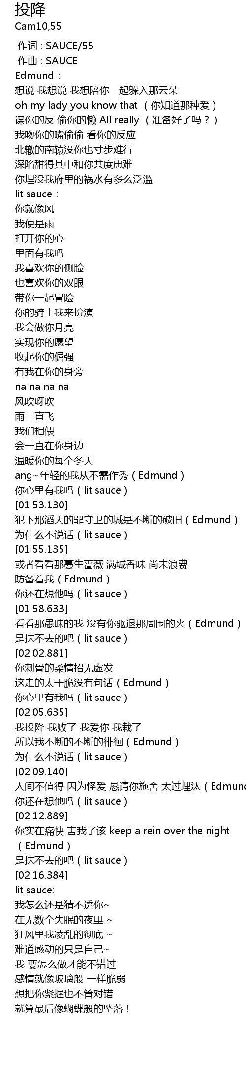 | [02:07.131] | wǒ tóu xiáng wǒ bài le wǒ ài nǐ wǒ zāi le suǒ yǐ wǒ bù duàn de bù duàn de pái huái Edmund |