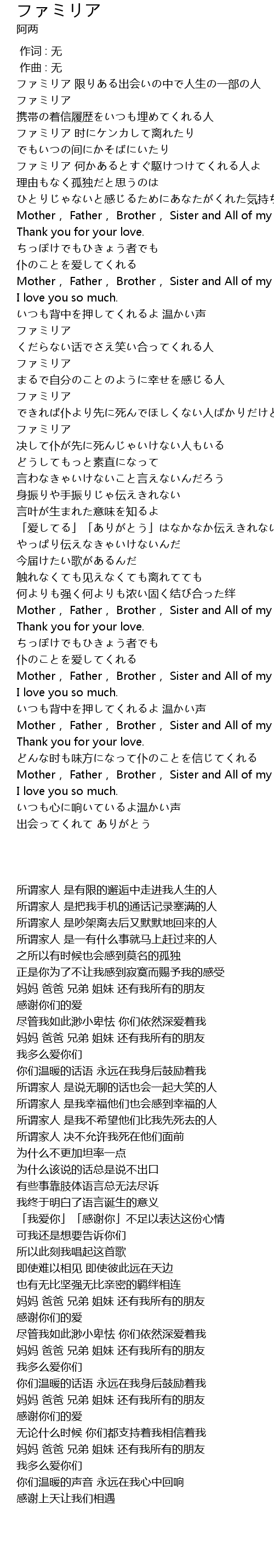 | [00:32.381] | ファミリア 时にケンカして离れたり でもいつの间にかそばにいたり |