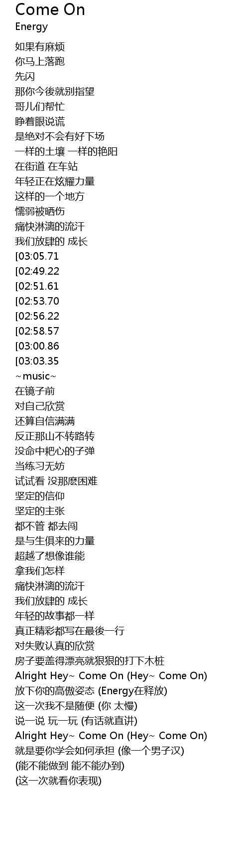 | [03:08.00][02:49.22][01:36.95][00:50.43] | Energy zài shì fàng |