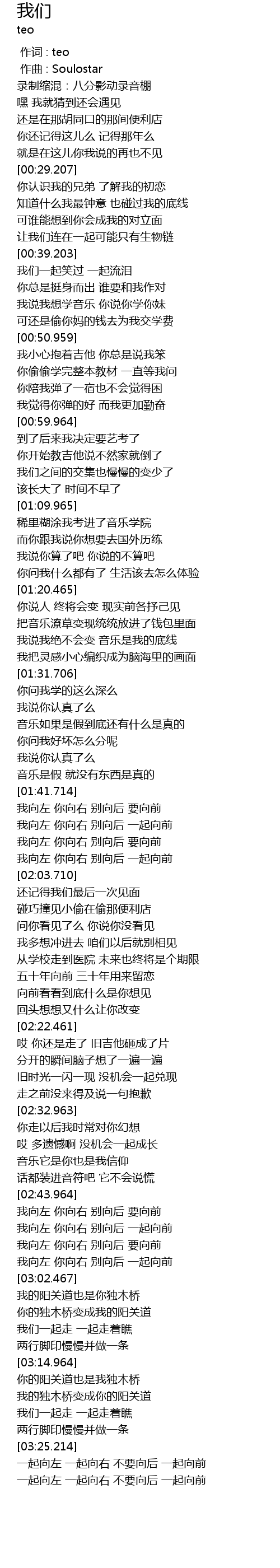 | [03:22.213] | 我们一起走 一起走着瞧 |