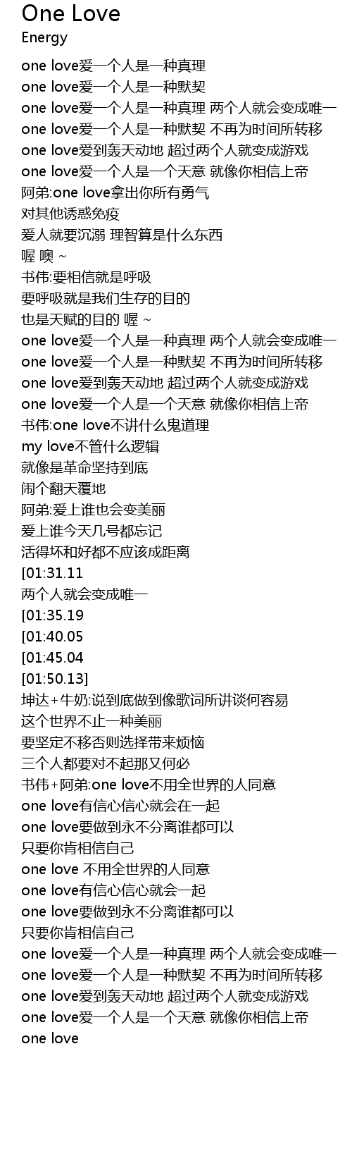 | [02:28.97][01:31.11] | one love ài yí ge rén shì yī zhǒng zhēn lǐ liǎng gè rén jiù huì biàn chéng wéi yī |