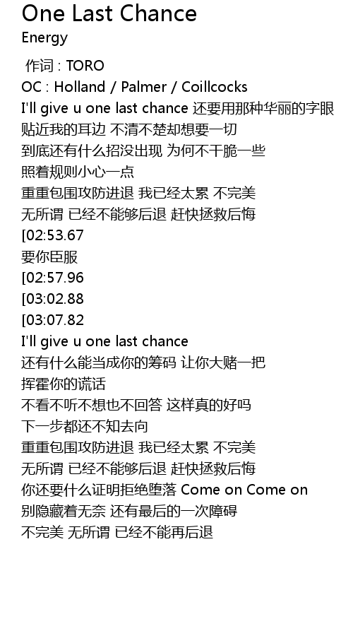 | [03:27.33][03:07.82][02:21.12][02:10.77][01:12.73] | Oh~ please don't waste ur time I'll give u one last chance |