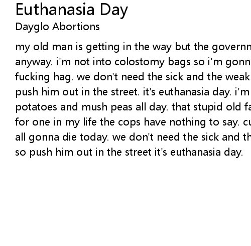 my old man is getting in the way but the government decided he's gonna die anyway. i'm not into colostomy bags so i'm gonna get rid of that dirty old fucking hag. we don't need the sick and the weak. stephen hawkins in a geek. so push him out in the street. it's euthanasia day. i'm tired of cooking mashed potatoes and mush peas all day. that stupid old fart said my mohawk looks gay for one in my life the cops have nothing to say. cuz the government decided your all gonna die today. we don't need the sick and the weak. bill gates is a geek so push him out in the street it's euthanasia day. |