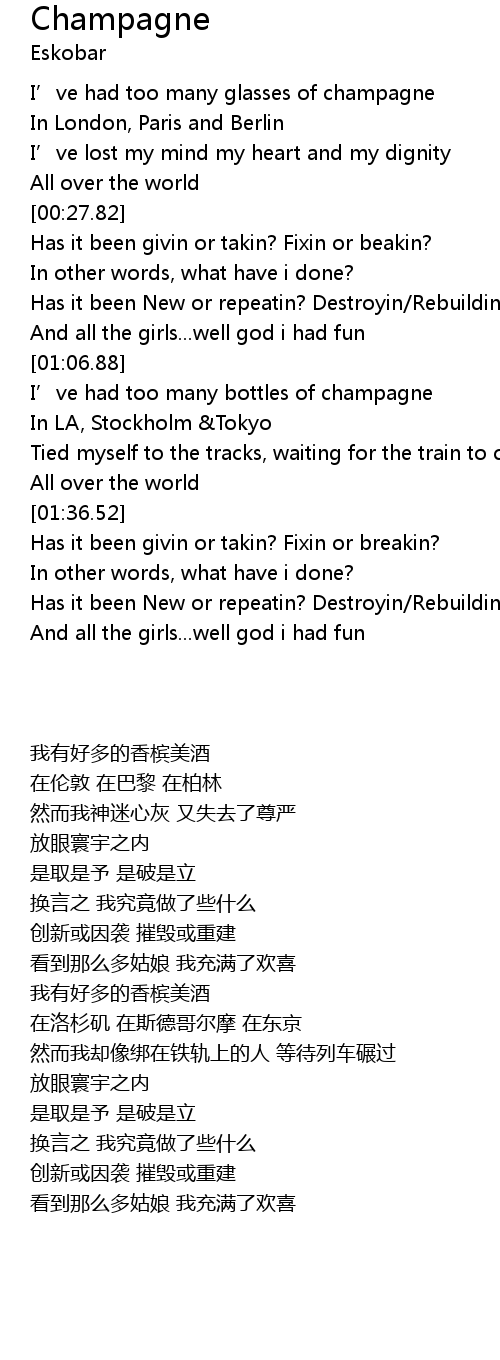 | [01:08.56] | I’ve had too many bottles of champagne |