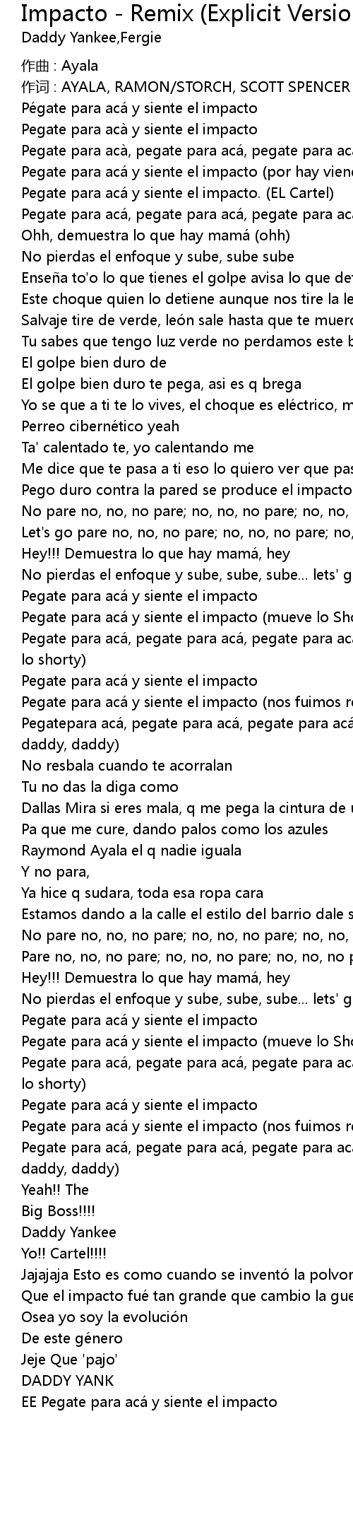 | Pegatepara acá, pegate para acá, pegate para acá y siente el impacto (daddy, daddy, daddy) | |